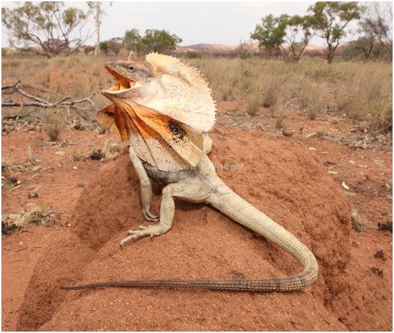 - Lagarto con chorreras (Chlamydosaurus kingii): Este lagarto tiene una táctica muy impresionante para desalentar a sus depredadores en la naturaleza. Si se siente amenazado, despliega una especie de collar formado por cartílagos y piel que normalmente descansa sobre su cuello. De ese modo aparenta ser mucho más temible de lo que en realidad es. Es carnívoro e insectívoro y suele pasar el tiempo mimetizado en los troncos de los árboles a la espera de que se acerque algunas de sus presas. Viven en Australia y en el sur de Nueva Guinea. Y se le conoce también como Clamidosaurio de King.