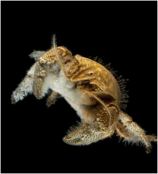 - Cangrejo yeti (Kiwa hirsuta): Es un cangrejo que vive en los mares del sur, cerca de la Isla de Pascua. Habita a más de 2000 metros de profundidad. Es ciego, tiene diez patas (decápodo) y es de color blanco amarillento. Su cuerpo está recubierto por una fina seda que le da ese aspecto tan original, pero que en realidad es un criadero de bacterias que se cree pueden ser parte de su dieta.