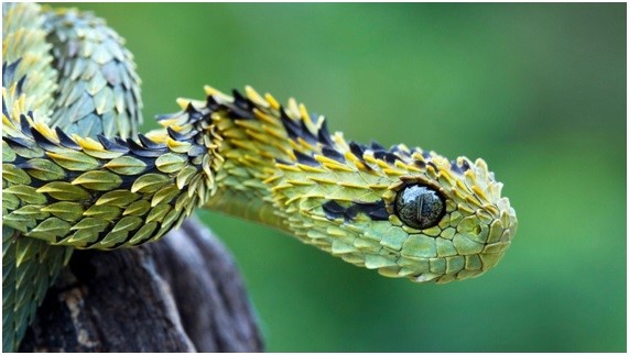 - Víbora peluda (Atheris): Son muy peligrosas (producen veneno hemotóxico) y si bien hay solo ocho especies conocidas, todas ellas viven en diferentes puntos de África (desde Sudáfrica al desierto del Sáhara) y son arborícolas. La más llamativa es sin dudas la Atheris Hispida, que es en la que más se aprecia la característica de que las escamas son sobresalientes y con forma de pequeñas plumas, de ahí su denominación común.