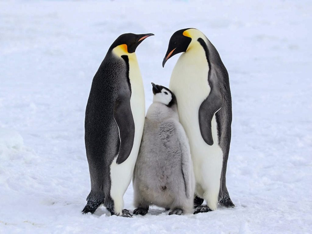 • Pingüino emperador: El pingüino emperador (Aptenodytes forsteri) es el más grande de todas las especies de pingüino y es endémico de la región antártica. Crecen hasta los 115 cm y pesan entre 40 y 45 kilogramos. Es la única especie de pingüino que se reproducen en la temporada de invierno en la Antártida. Ponen un solo huevo y el macho se encarga de empollarlo y cuidarlo mientras las hembras salen a buscar alimento. A la vuelta regurgitan lo que han comido para alimentar al polluelo y a su pareja. Son monógamos, pero se ha comprobado que pueden ser animales bisexuales.