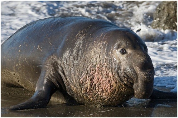 • Elefante marino: Los elefantes marinos del sur (Mirounga leonina) son los más grandes del continente antártico. Crecen unos 2 metros y pesan hasta 4 toneladas. Viven colonias multitudinarias y los machos luchan entre sí por el dominio de sus territorios y de las hembras. Se reproducen en tierra, pero durante la temporada de invierno, pasan la mayor parte del tiempo en el océano Antártico. Se alimentan de peces, calamares y crustáceos que encuentran en la naturaleza. Las hembras pueden pasar grandes temporadas sin comer mientras crían a los bebés.