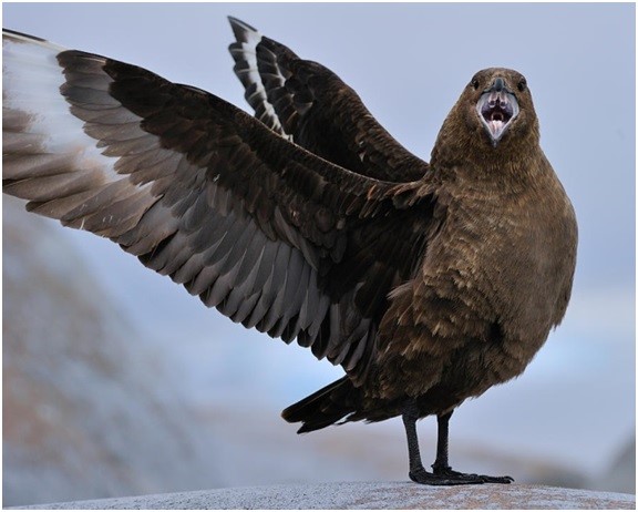 • Págalo o Skúa Polar del Sur: Son grandes aves marinas con alas voluminosas que se reproducen en la costa de la Antártida. Les gusta vivir en zonas de mar abierto, crecen hasta alcanzar un tamaño de medio metro y son de color marrón grisáceo. Las skúa comparten un mismo nido con un solo compañero año tras año. Anidan cerca de las colonias de pingüinos, para obtener alimentos más fácilmente, especialmente peces y polluelos de otras aves. En temporada de invierno migran al océano Pacífico Norte.