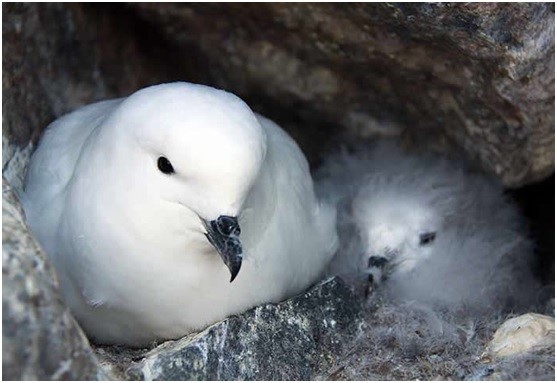 • Petrel de la nieve: Los petreles blancos (Pagodroma nívea) también se crían exclusivamente en la Antártida. Pasan la mayor parte del tiempo en el agua o en los icebergs de hielo. Es muy difícil identificar esta ave, ya que tienen el cuerpo blanco y se mimetizan a la perfección con el medio ambiente. Anidan en altos acantilados cerca del mar y se alimentan de pequeños peces y calamares. Necesitan 45 a 50 días para incubar sus huevos y tras la eclosión cuidan a los polluelos en parejas por dos meses más.