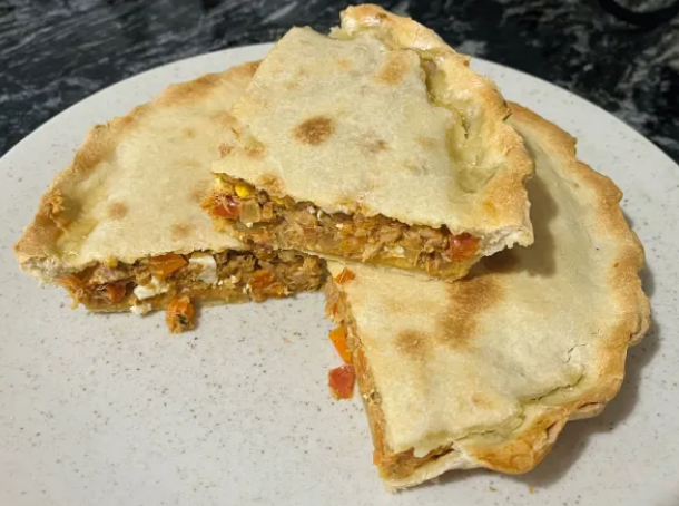 8. Haz algo de presión entre los dos discos de masa para sellar bien, emprolija los bodes. Haz una pequeña cruz en el centro para que funcione como volcán, retirando el exceso de humedad del relleno de la tarta de atún, así no se abrirán los bordes. Cocina la tarta de atún y huevo en el horno precalentado a 200-220 ºC, es decir, temperatura máxima, por unos 40 a 60 minutos.